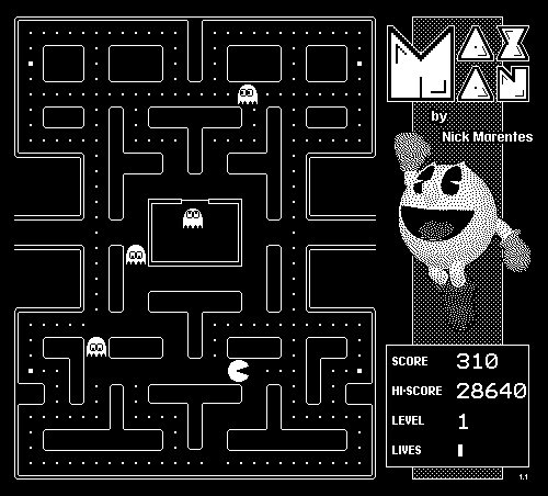 MaxMan 1.1 is here! New Features over 1.0... 1) Fast key response at the "Insert Coin" prompt for the start of a game. 2) Slightly more aggressive ghost chase intelligence. 3) Support for Wii Nunchuk with 100Khz and 400khz IC2 transmission speeds. 4) Fast loading of game screen via fonts file! This is the final version. Project finished. Enjoy!