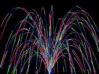 Fire Show Fountain ![]() MODE 2 Map Reset Dim integer cm(15)=(0,1,2,3,4,5,6,7,8,9,10,11,12,13,14,15) Colour Map cm(),cm() For I=0 To 2100 If Y>230 Then X=160 Y=240 x0=X:y0=Y x1=Cos(Rnd*Pi)*5 y1=5+Rnd*16 EndIf X=X+x1:Y=Y-y1:y1=y1-1 Inc C,-1:If C<1 Then C=15 Color Map(C) If X>0 And X<320 Then Line x0,y0,X,Y x0=X:y0=Y Next Do For N=0 To 14 T=cm(1) For i=1 To 14:cm(i)=cm(i+1):Next cm(15)=T For i=1 To 15:Map(i)=cm(i):Next Map Set Pause 100 Next For i=1 To 15 If i<3 Then cm(i)=Map(Int(Rnd*15)) Else cm(i)=0 Next Loop |