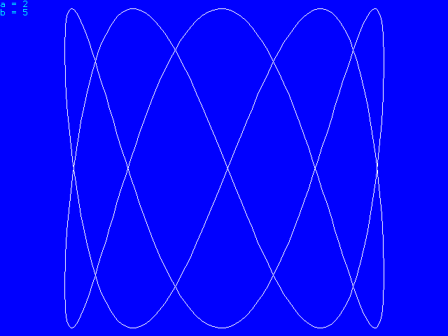 ∞ Lissajous Figures ∞ ![]() Option ANGLE DEGREES FRAMEBUFFER CREATE FRAMEBUFFER WRITE F Colour RGB(Cyan),RGB(Blue) CX=MM.HRes/2: CY=MM.VRes/2 Scale=0.95: AX=CY*Scale: AY=CY*Scale a=1: b=0: p=0: f=0: c=0 Do If p>360 Then p=0: EndIf If b>6 Then a=a+1: b=0: c=0: EndIf If a>5 Then a=1: b=0: c=0: EndIf If c=50 Then f=1 If a=Fix(b) Then f=0: c=0: EndIf EndIf If c=130 Then f=0: c=0: EndIf CLS sx= AX * Sin(p) + CX sy= AY * Sin(p) + CY For i= 0 To 360 x = AX * Sin(a*i + p) + CX y = AY * Sin(b*i + p) + CY Line sx,sy,x,y sx=x: sy=y Next i Print "a ="a: Print "b ="b FRAMEBUFFER COPY F,N,B Inc p: Inc c If f=0 Then b=b+.02: EndIf Loop Until Inkey$ <> "" End |