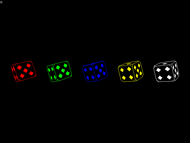 3D Dice ![]() MODE 1 TILE 0,0,RGB(RED),RGB(BLACK),16,40 TILE 16,0,RGB(GREEN),RGB(BLACK),16,40 TILE 32,0,RGB(BLUE),RGB(BLACK),16,40 TILE 48,0,RGB(YELLOW),RGB(BLACK),16,40 'Print "3D Draw" '-------------------------- Dim n=1, nv=24, nf=6+8, camera=1 ' Load vertices arrey Dim v(2,nv-1) Restore vertices2 For i=0 To nv-1: For a=0 To 2: Read v(a,i):Next :Next ' Load facecount arrey Dim INTEGER facecount(nf-1), facesize=0 Restore facecount2 For i=0 To nf-1: Read facecount(i): Inc facesize,facecount(i): Next ' Load faces arrey Dim INTEGER faces(facesize-1) Restore faces2 For i=0 To facesize-1: Read faces(i): Next ' Load colours arreys Dim INTEGER c(1)=(0,RGB(GREEN)) Dim INTEGER edge(nf-1)=(1,1,1,1,1,1, 1,1,1,1,1,1,1,1) Dim INTEGER fill(nf-1)=(0,0,0,0,0,0, 0,0,0,0,0,0,0,0) Math SCALE v(), 100.0, v() Draw3D CREATE 1,nv,nf,camera,v(),facecount(),faces(),c(),edge(),fill() Draw3D CREATE 2,nv,nf,camera,v(),facecount(),faces(),c(),edge(),fill() Draw3D CREATE 3,nv,nf,camera,v(),facecount(),faces(),c(),edge(),fill() Draw3D CREATE 4,nv,nf,camera,v(),facecount(),faces(),c(),edge(),fill() Draw3D CREATE 5,nv,nf,camera,v(),facecount(),faces(),c(),edge(),fill() '-------------------------- nv=84: nf=21: camera=1 ' Load vertices arrey Dim v1(2,nv-1) Restore vertices3 For i=0 To nv-1: For a=0 To 2: Read v1(a,i):Next :Next ' Load facecount arrey Dim INTEGER facecount1(nf-1) facesize=0 Restore facecount3 For i=0 To nf-1: Read facecount1(i): Inc facesize,facecount1(i): Next ' Load faces arrey Dim INTEGER faces1(facesize-1) Restore faces3 For i=0 To facesize-1: Read faces1(i): Next ' Load colours arreys Dim INTEGER edge1(nf-1)=(1,1,1,1,1,1,1,1,1,1,1,1,1,1,1,1,1,1,1,1,1) Dim INTEGER fill1(nf-1)=(1,1,1,1,1,1,1,1,1,1,1,1,1,1,1,1,1,1,1,1,1) Math SCALE v1(), 100.0, v1() Draw3D CREATE 6,nv,nf,camera,v1(),facecount1(),faces1(),c(),edge1(),fill1() '-------------------------- Dim INTEGER viewplane=400 Draw3D CAMERA n, viewplane Dim INTEGER x=0, y=0, z=6000 'Draw3D SHOW n, x, y, z 'END '================================================ Dim FLOAT yaw=Rad(1), pitch=Rad(2), roll=Rad(0.5) Dim FLOAT q(4) FRAMEBUFFER CREATE FRAMEBUFFER WRITE F Do Math Q_EULER yaw, pitch, roll, q() Draw3D ROTATE q(),1 Draw3D ROTATE q(),2 Draw3D ROTATE q(),3 Draw3D ROTATE q(),4 Draw3D ROTATE q(),5 Draw3D ROTATE q(),6 Draw3D SHOW 1,x,y,z Draw3D WRITE 6,x,y,z Draw3D SHOW 2,-1800,y,z Draw3D WRITE 6,-1800,y,z Draw3D SHOW 3,-3600,y,z Draw3D WRITE 6,-3600,y,z Draw3D SHOW 4,1800,y,z Draw3D WRITE 6,1800,y,z Draw3D SHOW 5,3600,y,z Draw3D WRITE 6,3600,y,z Inc yaw,Rad(4) '1 Inc pitch,Rad(8) '2 Inc roll,Rad(2) '0.5 FRAMEBUFFER copy F,N,b Loop Until Inkey$<>"" FRAMEBUFFER WRITE N Memory FRAMEBUFFER close End vertices2: '24/14 Data -4,3,-4, -3,4,-4, 3,4,-4, 4,3,-4, 4,-3,-4, 3,-4,-4, -3,-4,-4, -4,-3,-4 Data -4,4,-3, 4,4,-3, 4,-4,-3, -4,-4,-3, -4,4,3, 4,4,3, 4,-4,3, -4,-4,3 Data -4,3,4, -3,4,4, 3,4,4, 4,3,4, 4,-3,4, 3,-4,4, -3,-4,4, -4,-3,4 facecount2: Data 8,8,8,8,8,8,3,3,3,3,3,3,3,3 faces2: Data 0,1,2,3,4,5,6,7, 12,17,18,13,9,2,1,8, 3,9,13,19,20,14,10,4 Data 16,12,8,0,7,11,15,23, 11,6,5,10,14,21,22,15, 19,18,17,16,23,22,21,20 Data 8,1,0, 9,3,2, 10,5,4, 11,7,6, 12,16,17, 13,18,19, 14,20,21, 15,22,23 vertices3: '84/21 Data 0,1,-4,1,0,-4,0,-1,-4,-1,0,-4 '1 Data -2,4,-1,-1,4,-2,-2,4,-3,-3,4,-2, 2,4,3,3,4,2,2,4,1,1,4,2 '2 Data 4,-1,-2,4,-2,-1,4,-3,-2,4,-2,-3,4,1,0,4,0,1,4,-1,0,4,0,-1,4,3,2,4,2,3,4,1,2,4,2,1 Data -4,3,2,-4,2,1,-4,1,2,-4,2,3, -4,3,-2,-4,2,-3,-4,1,-2,-4,2,-1 '4 Data -4,-1,2,-4,-2,1,-4,-3,2,-4,-2,3, -4,-1,-2,-4,-2,-3,-4,-3,-2,-4,-2,-1 Data -2,-4,-3,-1,-4,-2,-2,-4,-1,-3,-4,-2, 2,-4,-3,3,-4,-2,2,-4,-1,1,-4,-2 '5 Data -2,-4,1,-1,-4,2,-2,-4,3,-3,-4,2, 2,-4,1,3,-4,2,2,-4,3,1,-4,2 Data 0,-4,-1, 1,-4,0, 0,-4,1, -1,-4,0 Data 2,3,4,1,2,4,2,1,4,3,2,4, -2,3,4,-3,2,4,-2,1,4,-1,2,4 '6 Data 2,1,4,1,0,4,2,-1,4,3,0,4, -2,1,4,-3,0,4,-2,-1,4,-1,0,4 Data 2,-1,4,1,-2,4,2,-3,4,3,-2,4, -2,-1,4,-3,-2,4,-2,-3,4,-1,-2,4 facecount3: Data 4, 4,4, 4,4,4, 4,4,4,4, 4,4,4,4,4, 4,4,4,4,4,4 faces3: Data 0,1,2,3 Data 4,5,6,7, 8,9,10,11 Data 12,13,14,15, 16,17,18,19, 20,21,22,23 Data 24,25,26,27, 28,29,30,31, 32,33,34,35, 36,37,38,39 Data 40,41,42,43, 44,45,46,47, 48,49,50,51, 52,53,54,55, 56,57,58,59 Data 60,61,62,63, 64,65,66,67, 68,69,70,71, 72,73,74,75, 76,77,78,79, 80,81,82,83 |