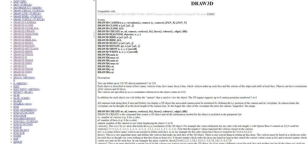 @Stan, From the PicoMite manual: 3D Engine NOT AVAILABLE IN WEBMITE VERSIONS The 3D Engine includes ten commands for manipulating 3D images including setting the camera, creating, hiding, rotating, etc. See the document The CMM2 3D engine.pdf in the PicoMite firmware download for a full description of these commands and how to use them. Bill Keep safe. Live long and prosper. |