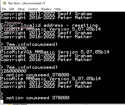 B13 and b14 for the VGA both have issues (change in SDK and compiler?) when running at 126MHz in mode 1 - 126MHz in mode 2 and 252MHz and 378MHz in both modes both work fine for me. Will post an update later. non-VGA seems to be OK and seems to run faster than before UPDATE b14 for VGA replaced in the download to fix issue with mode 1 @ 126MHz Edited 2022-07-07 20:35 by matherp |