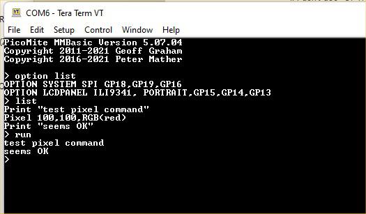 If I have the OPTION SYSTEM SPI GP18, GP19, GP16 OPTION LCDPANEL ILI9341, P, GP15, GP14, GP13 set up in teraterm and the lcd and touch and sd card work then do I need to tell my code the display values? it's not clear for me. Why do I get lcd not configured error when it sees pixel x,y,colour if it is configured and works? I can't see any explanations of error messages. I got the display drawing circles in front of me... why can't I code that? |