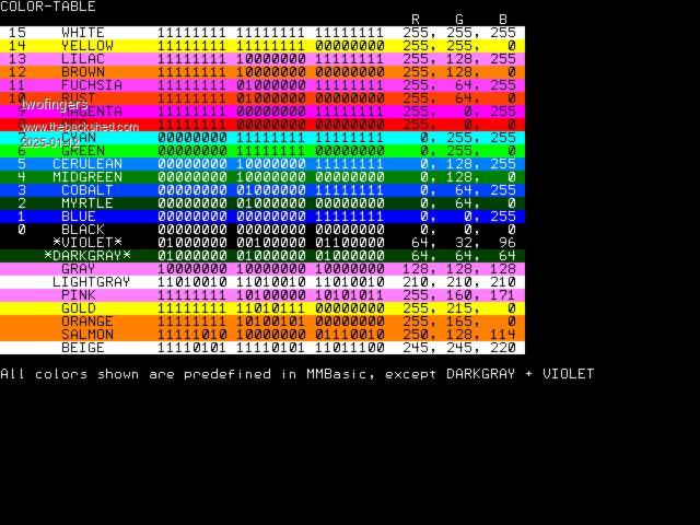 @Harm, thanks! Good to know. My RP2040s only have console. That also explains why Vadim implemented it that way. I'll change it. Kind regards Michael So, I changed the "mode 3"-line (LN: 148) to If Instr(1,DV$,"2350") Then If Instr(1,DV$,"VGA") Or Instr(1,DV$,"HDMI") Then MODE 3 EndIf I hope, this fixes the issue? fm115.2.zip Any comments or suggestions are welcome. Edited 2025-01-11 09:16 by twofingers causality ≠ correlation ≠ coincidence |