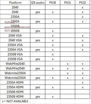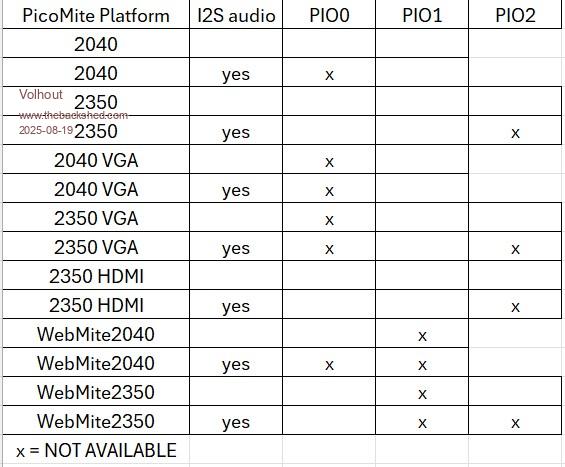 Hi Peter, I understood that I2S audio uses PIO0. Correct ? All other audio systems do not use PIO. Is below overview correct ? ![]() Volhout PicomiteVGA PETSCII ROBOTS |