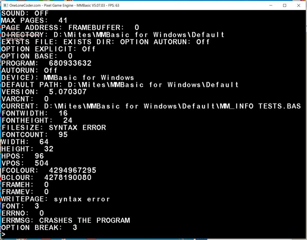 MM.INFO(FILESIZE) gives syntax error -MM.INFO(WRITEPAGE) gives syntax error Perhaps try specifying a filename or directory name in the function? Shouldn't crash of course but calling it before there is an error makes no sense There is one - BLACK I'm not implementing changes to the code that aren't on the CMM2 except where absolutely required by the architectureEdited 2022-02-23 08:36 by matherp |