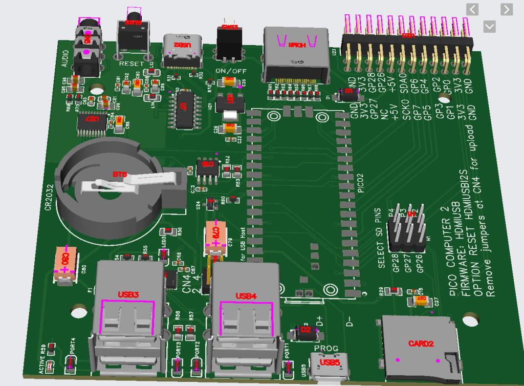 If you move the USB connectors and the SD card slot a little, you can move the Pico2 to the front edge of the board, which eliminates the need for an additional connector for programming. |