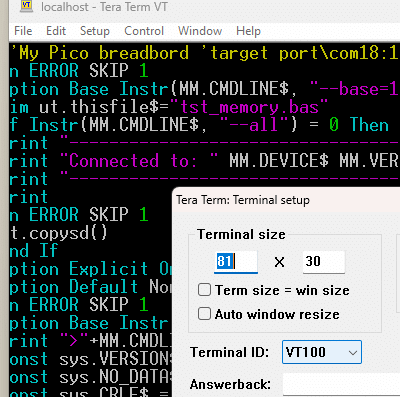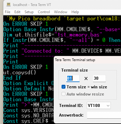 Terminal bug: Using the latest available ‘PicoMite RP2040 v6.00.03’ on a genuine RPi 2040 Pico. Accessing it via USB in TeraTerm. TeraTerm terminal set to 80x30. OPTION DISPLAY 30,80 is set. All works as expected until I enter the EDITor. TeraTerm then switches to 81x30. This then leads to the issue I am seeing. If I edit the program code in any way, and then press ESC, the whole screen jumps one character to the left (I.e, I effectively loose the first column from the screen -but it is not lost forever from the code). If I acknowledge the ‘Exit and discard all changes (Y/N):’ with N, then the screen redraws correctly (ie the first column reappears). I believe the two issues above are linked. Not tried on any other versions. I have three other OPTIONs also set, possibly the first one ‘interfering’: SERIAL CONSOLE COM1, GP0,GP1,BOTH COLOURCODE ON CPUSPEED 150000 Be interested if anyone else can replicate this…. |