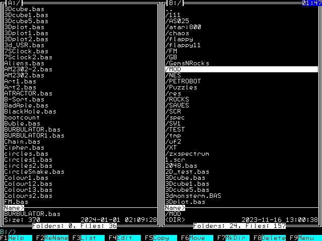 Updated FM to version 1.23 FM123.zip + works from USB keyboard + Sort Order - [BackSpace] switch key (???) + and other code optimizations Perhaps someone can suggest a more convenient button for switching the sorting order? Thanks to @twofingers for the method of sorting files, I honestly spied on you Although this sorting noticeably slowed down the update of the disk panel with a large number of files. Other tips for improving the program interface are also accepted. |