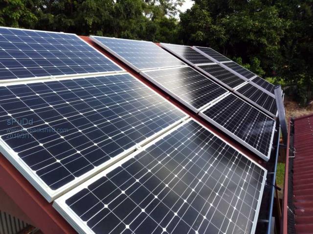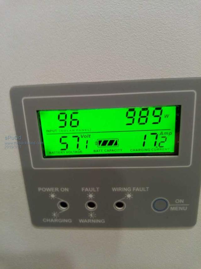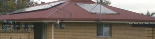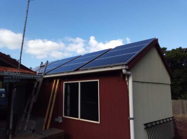 The panels are mounted on the old shed which is soon to be demolished. Its an ideal test bed. The panels were arranged to use the maximum roof space with an access gap between rows. Its an east-west configuration which so called experts say won't work. My data shows it works fine. The battery bank reaches absorption voltage by 10am-12pm most days, then floats once that is done. I never run the bank below 25% depth of discharge. If its raining I won't make full power, so I switch back to the grid & top up the bank. The panels make 10% of maximum power in the rain in a worst case. Version 2.0 comprises 84x 250W (21KW) poly panels (which I have stored onsite) across the house roof and about 6-8KW on the new shed roof. By my calculations, even when its raining I'll still have enough to charge & run. When its sunny, I'll have excess to dump into various loads.