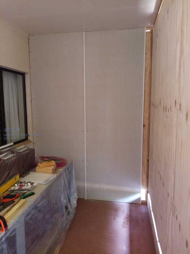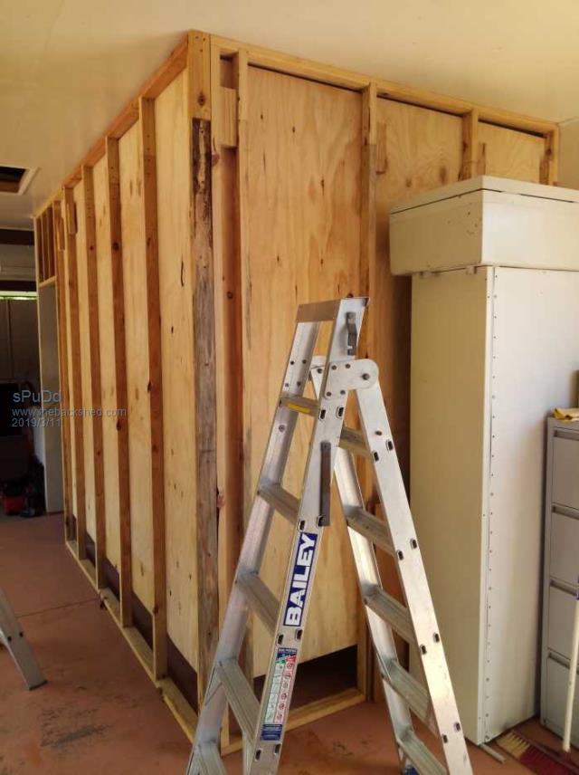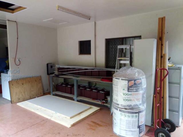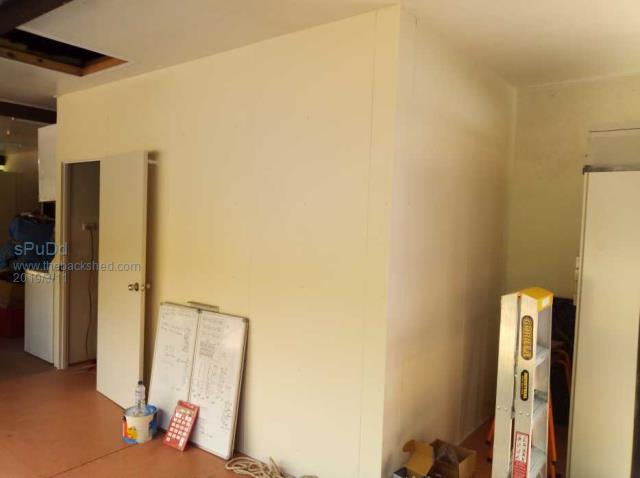 The pine studs were thinned down on the inside to allow the ply sheets to be recessed into them. Then the fibro sheets went flush over the top. This gives excellent wall strength, something to screw equipment to, and a fire resistant surface. The ceiling is also fibro with insulation on it. The floor & existing walls are concrete.