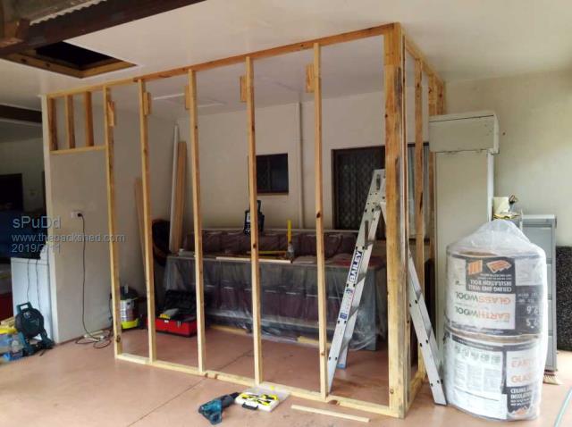 So I allocated a section of my back patio that will eventually be extended & turned into another bedroom & a laundry. This build is temporary and everything will be demolished in about 12-24 months time. Version 2.0 will be part of the new shed to be built soon. So for about $800 I bought the pine framing, ply, fibro sheets, insulation, door & other bits to construct the room & put it together over a weekend.