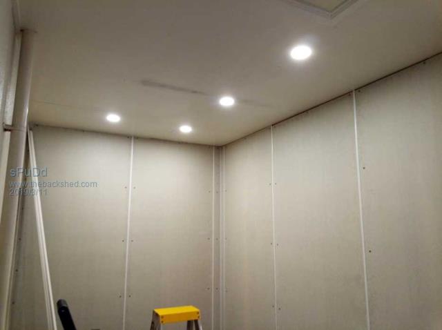 The lights are standard 10W LED down lights fed by a 12V boost converter from a 12V power supply & battery in a steel casing. This ensures there is light in the room even if the system fails. I installed hydrogen sensors, motion & door sensors & smoke detectors, which are all linked to the house security system which alerts me via the 4G network of any problems. And a CCTV camera is connected to the existing house CCTV system.