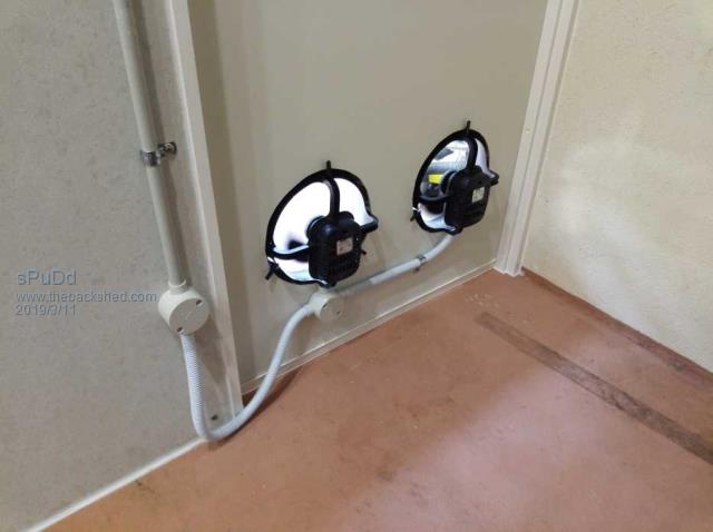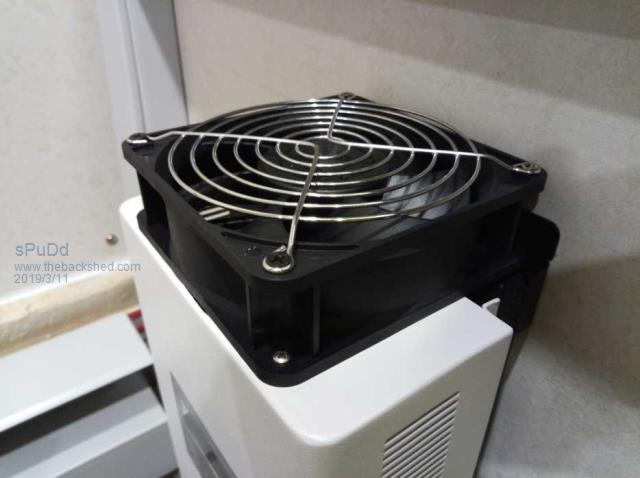 Two vent fans provide positive pressure clean cool air into the room. They use about 30watts total. I considered fitting a split system to the room, but its not worth the short term effort. I will however fit one to the V2.0 room to keep everything cool in our 46C summers. They also bring the air in low across the battery bank and force the hot air up and out. Works well enough.