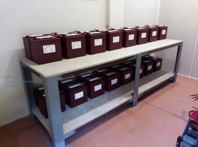 Battery rack I made years ago from scrap steel & 20mm cement sheet. Weighs almost as much as the batteries. I have to move it with trolleys or a pallet jack.