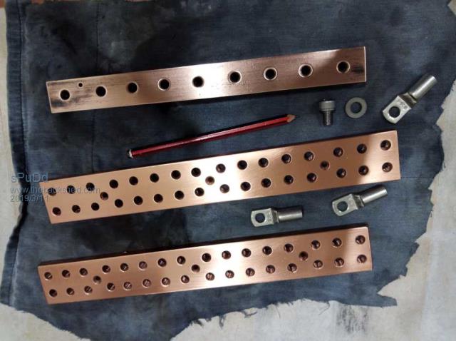 I drilled & tapped my own copper buss bars to suit. If you ever get the idea to do the same thing, get some other sucker to do it. Copper hates being machined. I had to use cobalt bits & taps with lots of cutting lube & even that took me several hours of careful work. I then lapped the bars smooth on wet & dry paper on a glass sheet. A coating of Lanox was applied to prevent oxidation.