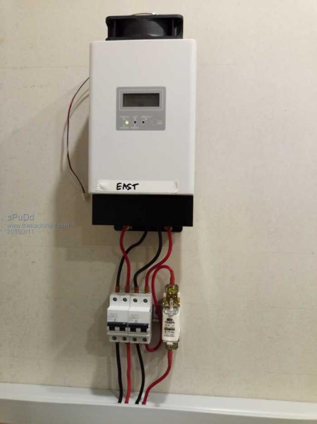 PCM60X 3KW chargers are connected to an east & west panel bank respectively. Each panel bank is rated at 2.4KW (4.8KW total). 12x 200W mono panels bought second hand online. Work 120%. Seriously, I've seen cold winter days peak at 2900W, and summer as well if the panels get rain followed immediately by sunlight. Occasionally it causes the DC breakers to trip, which then sends me an email via the monitoring software that came with the chargers.