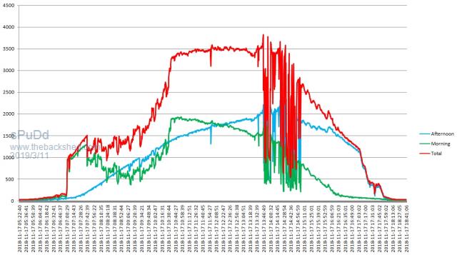 Graphed outputs from the chargers. A bit of cloud haze in the morning followed by patchy cloud in the afternoon. The east & west setup compliment each other and form a solid supply during the peak of the day.