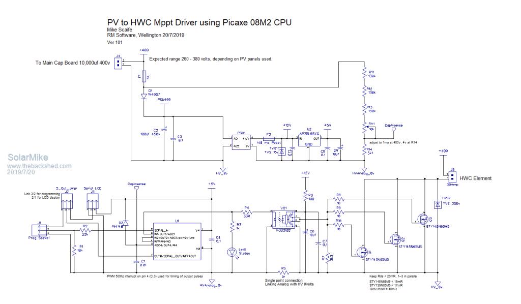 Thought I would try using a picaxe 08M2 cpu running at 32 Mhz in the basic circuit rather than the 555 timer, and implement a simple mppt algorithm to extract max power from the PV array.