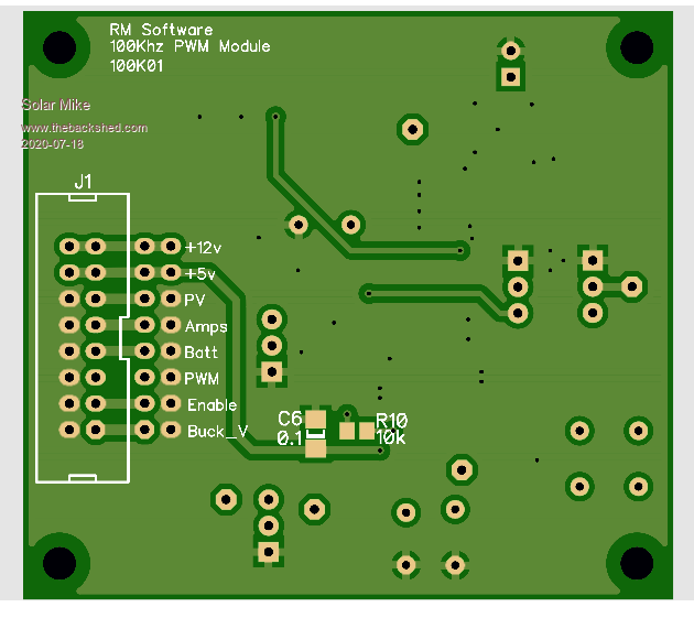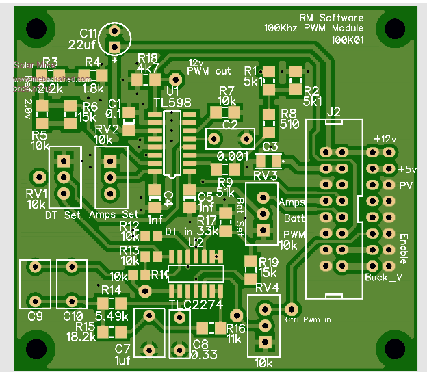 PCB for above design, 57 x 63mm: Most components bottom mounted, as board flips over, top of controller.