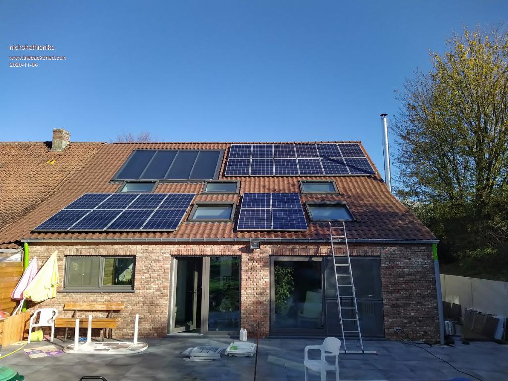 A practical example today @ 11.30: Pump is running at 5l/min, and in/out is 30/40°C. That's about 3.4kW output. Outside it is 9°C, clearsky, sun is far from 100% on the panels, you can see at the shading. A solar panel 280W on the same angle without shading is giving 31V 5A01 --> 155W, 8 panels on the same area would bring me about 1240W. So you see, the thermal panels are a lot more efficiënt in clear sky, the actual usefull thermal area is 11.1m˛ (Tisun Fi3/4), roof area is 3.01*4.01m. Offtopic, the group of 4 panels I did yesterday, it took me more than a day to get those installed... Ones my aluminium bars were mounted, I discovered I had 40mm brackets instead of 35mm... So I had to adjust (file,saw,grinding...) them, it took me more than 2h for just that.... Installing solar panels on a roof like ours is a real pain... I will try to make a new measurement in a few hours. |