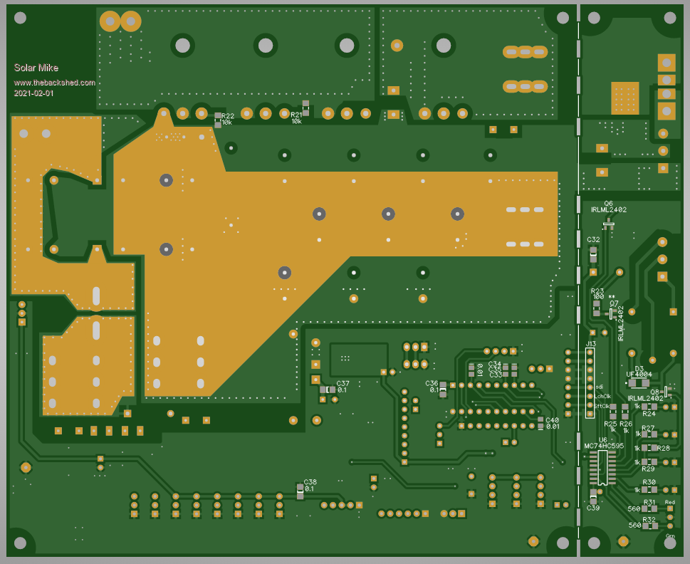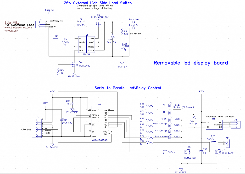For this higher power 60 amp design I have standardized the input\output cap's to the smaller 18mm dia foot print and more of them, each has a >3 amp ripple rating, this allows for better heat dissipation over the bulky 35mm types. The driver pcb is the same design as for the last 14M2 version and allows optionally a synchronous buck converter. Have expanded the removeable led display section to include a relay that is activated when in float charge mode and a 20 amp high side mosfet switch that is under cpu control, the load can be turned off on at low\high abnormal battery voltages.