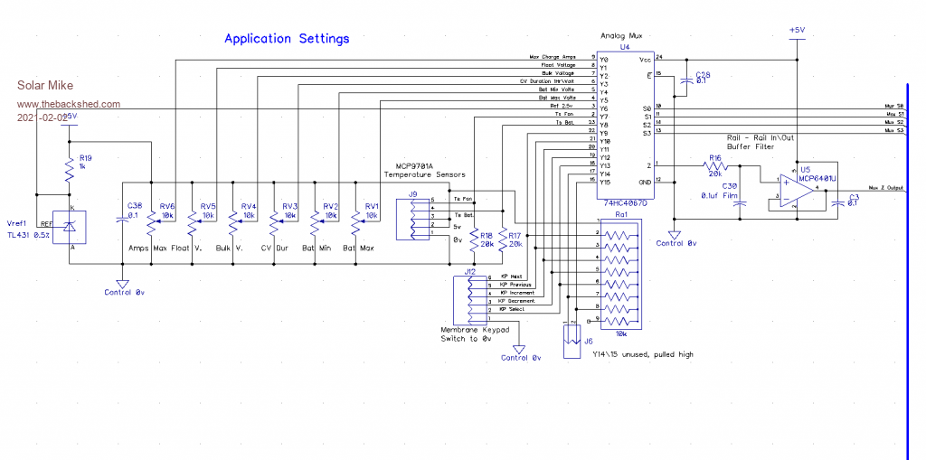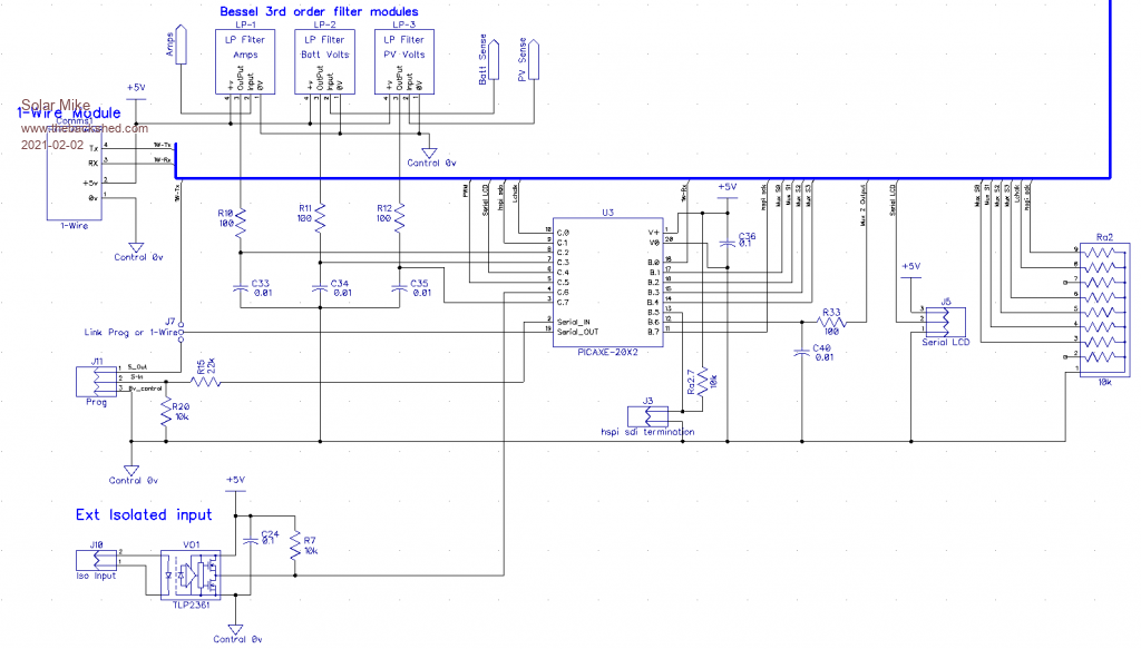 5: PV and Battery voltage sensing; I have found simple 3rd order active filters work much better than using just a large capacitor alone, the response is quicker and noise level lower. I now use an analog mux for selection of all analog signals with the mux output going via a single 3rd order filter then the CPU ADC.