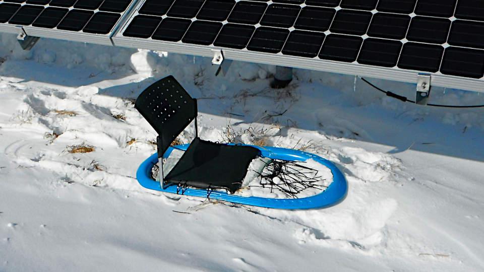This is a cable tie installation sled. It's a cheap office chair cable-tied to a kid's sled. It allows the field worker to scoot about under the panels, installing cable ties around the guides in the racking. This would have been in use, but on the day we audited the site, it was a slightly brisk -38 degrees C, and the installation crew had been sent home because the cable ties were getting brittle and would snap with the cold. It was cold enough that soles of your boots froze, as did your over-trousers. We were walking around like Frankenstein all day.