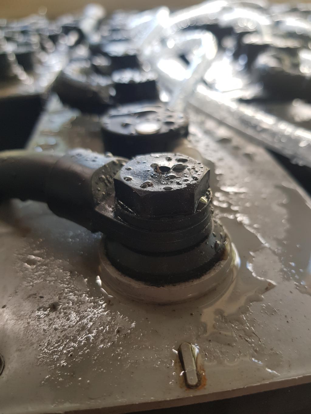 once a year I use a battery terminal protector spray on each terminal, I used to use the proper " battery terminal protector " from CRC, but since I've found silicone spray to be effective, I disconnect that bank from the system via individual breaker, the systematically remove each hold down bolt with rattle gun, check / clean if needed / spray.. usually taking about an hour to complete. as you can see in the pics these have a " seal " around each terminal which dramatically reduces corrosion and is very effective.. to date I've had NO issues with corrosion, and found minimal when servicing..