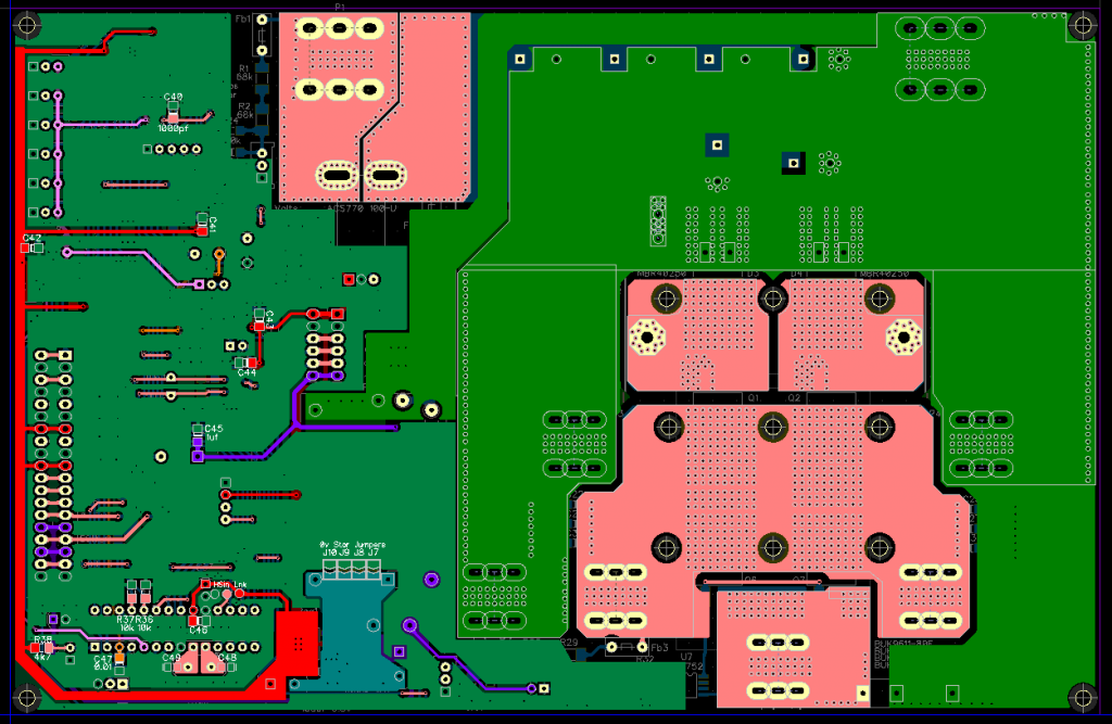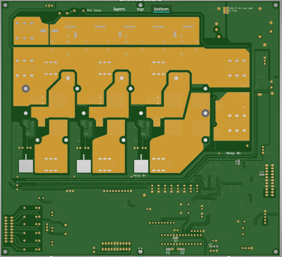Copper bus bars run under the capacitor module and also soldered to the output tracks. If I limit each phase to nominal 30 amps then combined will be 90 amps.