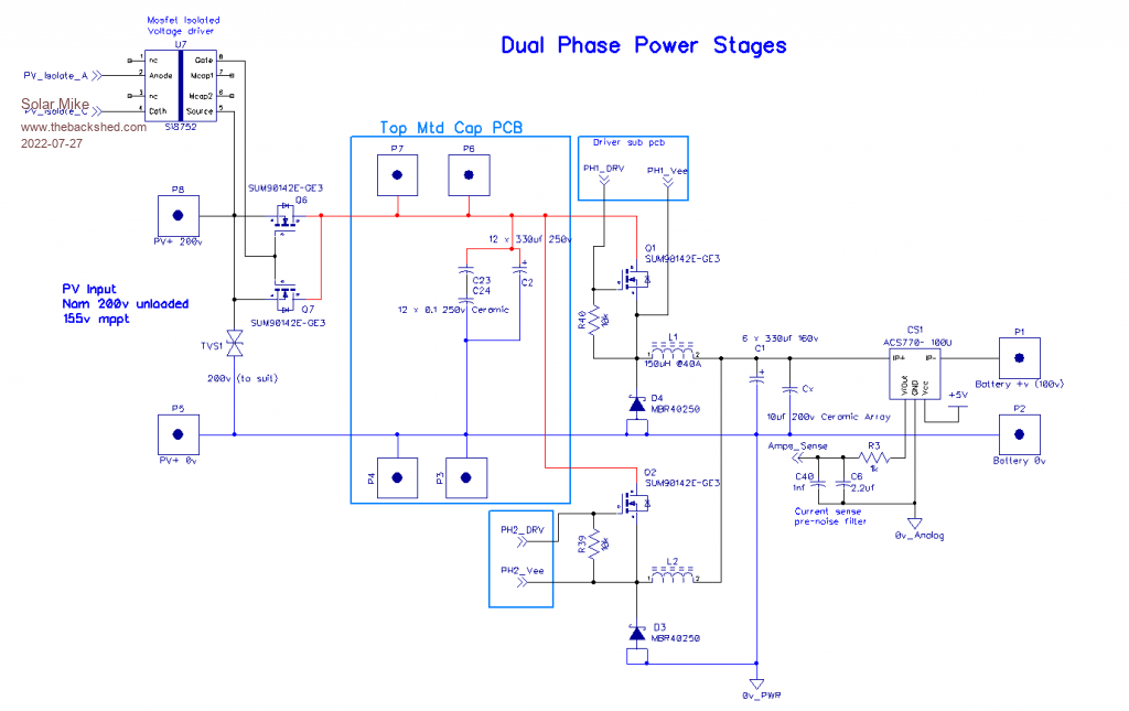 I am revisiting this in order to use smaller power components - inductors, mosfets and Schottky devices in each phase, then combine their outputs to the battery. The common high voltage (250V) Schottky diodes only have a 40 amp current rating, combining multiples of these in parallel to get a higher current is very bad design and doomed to failure; - note this doesnt apply to Silicon Carbide devices with their positive temperature coefficient. Its also easier to make small 30 amp inductors than 60 amp monsters and a lot cheaper.