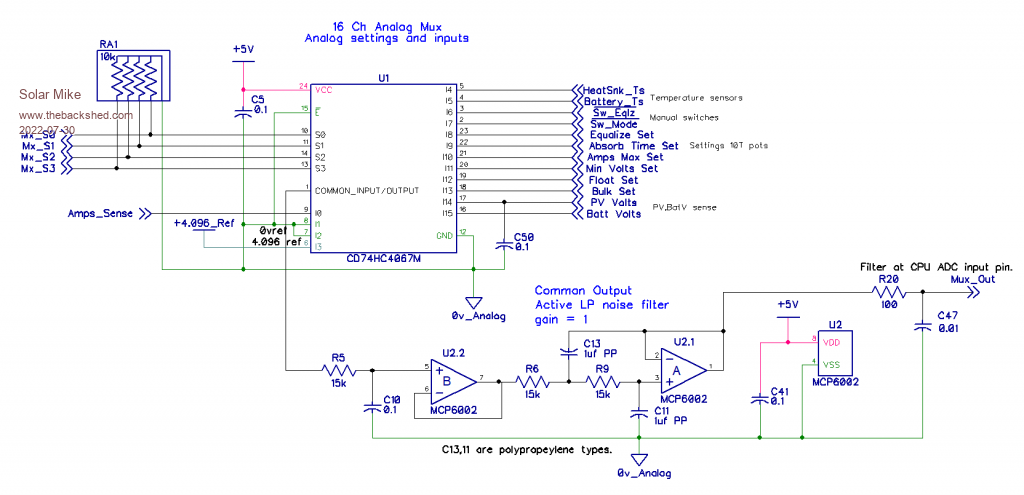 MPPT control measures the PV volts and charge current every 200 mSec, this gives plenty of time for the input to be selected and stabilize. The various charge settings inputs are  20K 10T pots with a precision reference source, 4.096V; this is also applied to the CPU ADC +Ref pin.