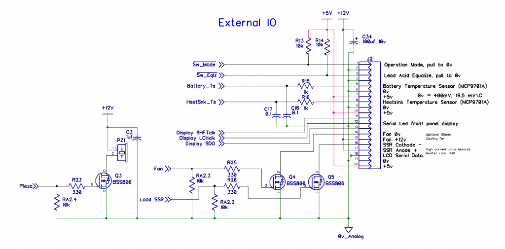 A 20 pin spring loaded connector used here, connections to the active temperature thermistors (MCP9701), various manual switches, LCD serial display, 50mm fan and external high power SSR load switch.