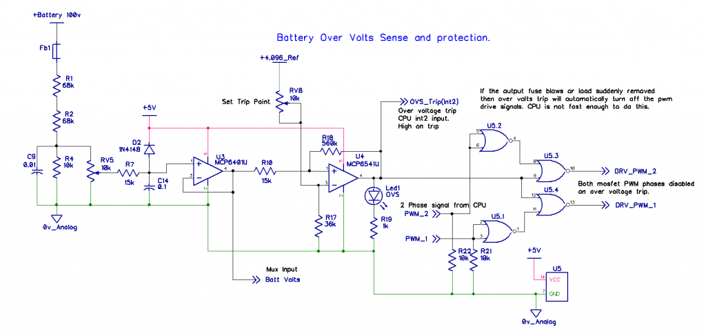 Battery sample taken off RV5 via op amp buffer, same sample is also used for fast over voltage protection using comparator U4; if the charger is under high load and is suddenly removed, the output voltage can rise faster than the CPU ability to control by reducing PWM duty. The comparator trip point is set to about 10V higher than normal and will disable the PWM drive signals, allowing the CPU to catch up; this would not happen if the code was written in assembly or C+, basic is a little slow. I really must learn PIC assembler, used to spend 1000's hours writing Z80 assembler many years ago.