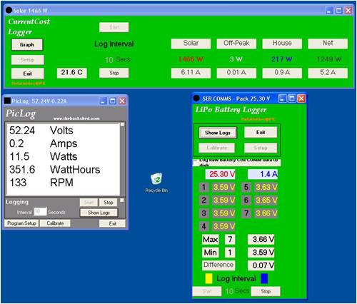 Here are some screens from my PC with remote access to my Data Logging computer. I am monitoring a windmill and battery with a Piclog, A Lithium battery pac with a combination picaxe system, and the solar panel power and house consumption with a CurrentCost meter. The front end and graphing software I have adapted to suit each different application. I have data update rates set at 10 seconds.