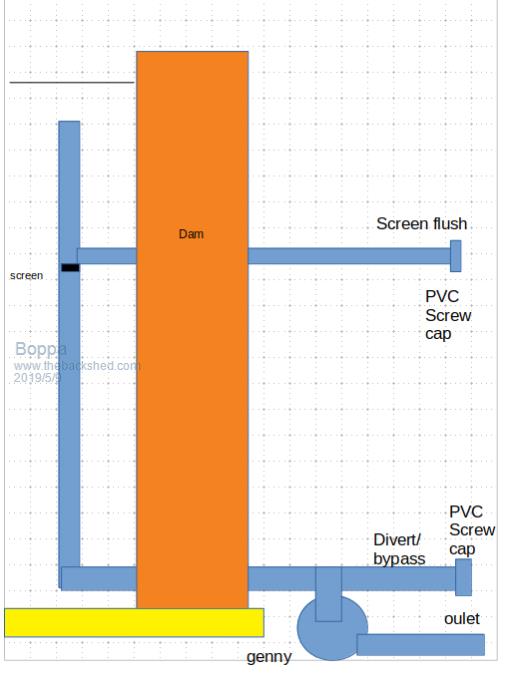 We made a neat 'self cleaning' screen to the pelton wheel with a pvc t piece that had a second pipe straight through the dam wall a bit higher than the outlet the screen was on the bottom of the tee that went to the wheel outlet- the advantage was that if your screen got blocked with leaves or whatever, by opening that top outlet, the water flowing through that pipe would 'suck' all the debris off the top of the screen and out through that pipe