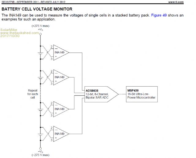 [quote] thought about a small PIC CPU with digital data isolator chip and 4 wires running between all cell devices and a master unit, Data In/Out and 3.0 and 0 volts.