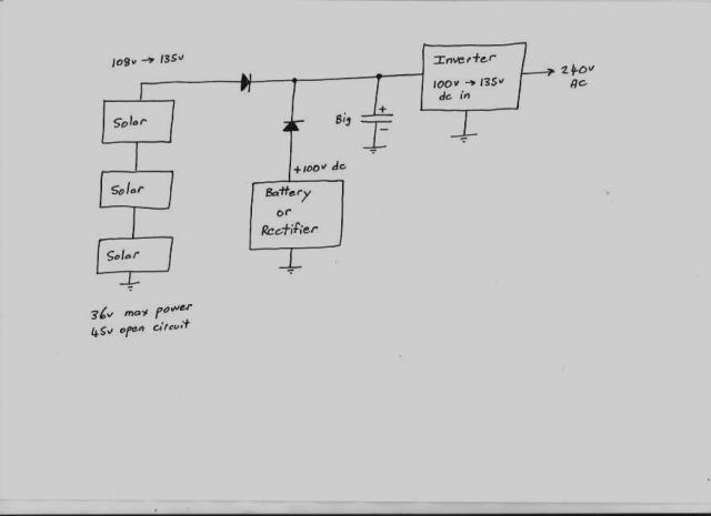 At some voltage slightly less than the solar panel maximum power voltage, an alternative reliable source of power must be provided to run the inverter at night, or when there are heavy day time peak loads in very cloudy weather.