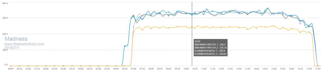 The angle of the sun on the panels makes little difference to the voltage. Here is the voltages for today from my 2 GTI's, it was cloudy and the regulator has not had any effect on this. The blue and green are identical arrays, the mauve is the same panels and number also but in a different position and the yellow is different panels. The voltage changed very little all day from before dawn to after sunset. It was overcast all day but some periods the cloud was much thinner than others.