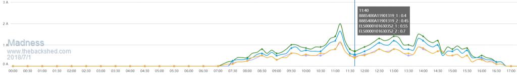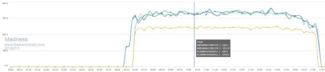 In fact, by switching to the daily generated kwhrs menu on both, as noted same number/brand of panels, same gti inverter, about three houses apart, the east/west split actually develops more kw/hrs a day than the pure north facer, even though its midday peak is slightly less