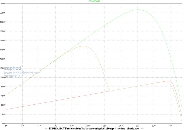 Thank you so much Aaron, I have no sun at the moment or at least not enough to show a shadow so I tried simulating it instead, here is the output of a single panel with first no shading, then one row of 6 then one row of 10 cells the shading factor being *0.25). When the shading diodes are active (10 cells shaded) the output has the classic twin peak mpp's (140 & 70W) that some controllers )including I suspect mine) get confused by (they latch onto the wrong peak). I apologize for the poor image quality this is a bit of problem when printing plots from LTspice. Edited by zaphod 2019-01-14Cheers Roger 1Kwp DIY PV + Woodburner + Rainwater scavanger :)