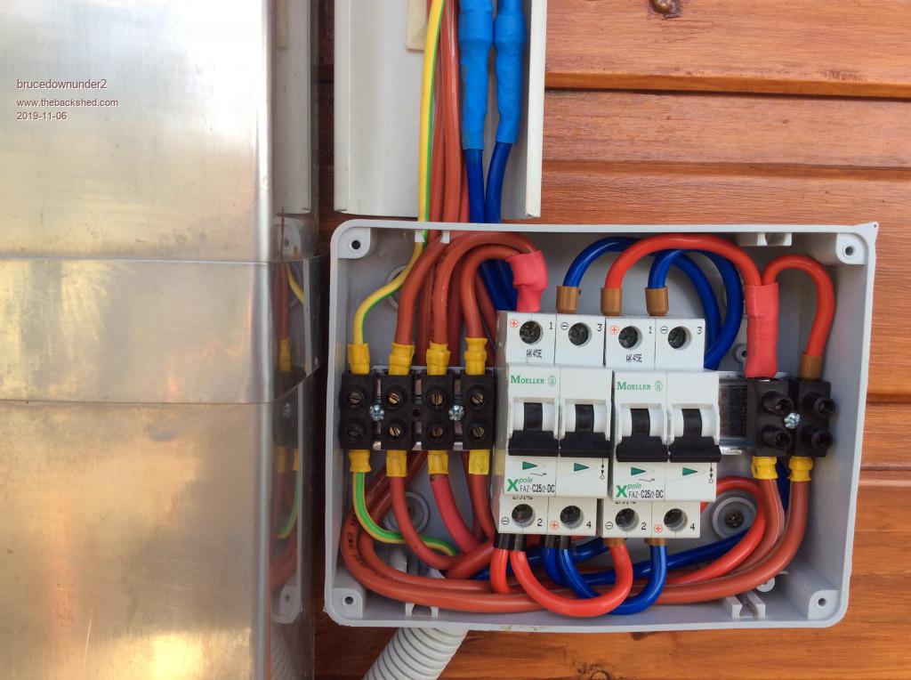 Installed 6mm tinned single runs from the panels to the junction/disconnect weatherproof box at chest height on the outside wall.  Breakers are 25Amp DC polarised (be careful with "in/out" positive and negative).