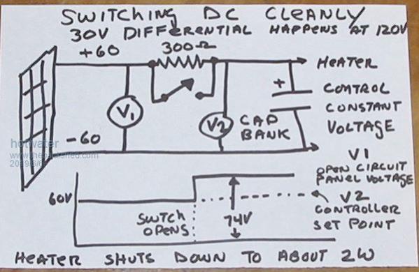 So, the switch never sees more than the open circuit panel array voltage minus the set voltage. As the voltage drops less than a volt on the capacitor bank the heating element almost immediately turns off. As the capacitor bank is nearly fully charged the turn on surge current. This circuit easily works to a little over 100V.