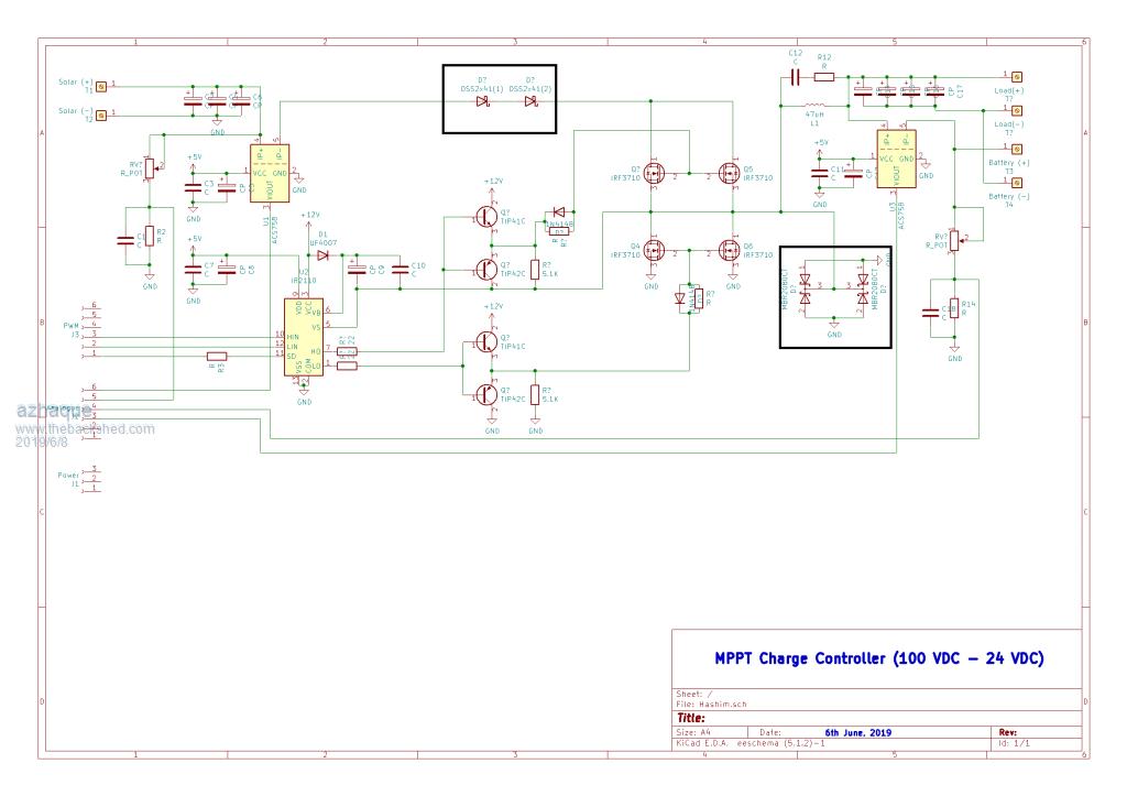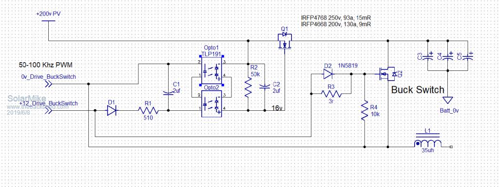 The above image is the MinimuMppt redesigned with Schottky diodes, both in the main current path as well as MOSFET protection during low duty cycle (both highlighted).