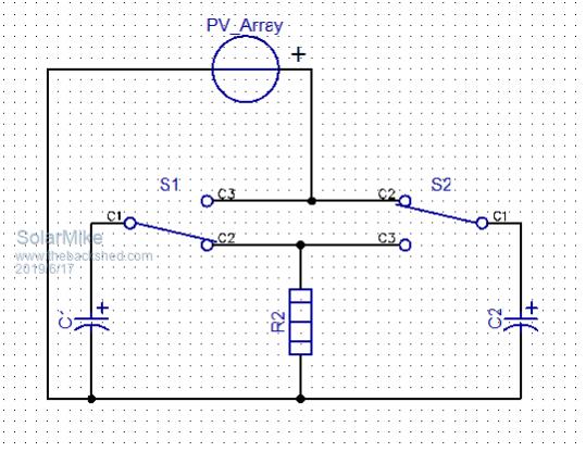 So the voltage on the capacitor bank rises and falls between two fixed voltages, and those are set to coincide with the most efficient solar panel operating voltage range.