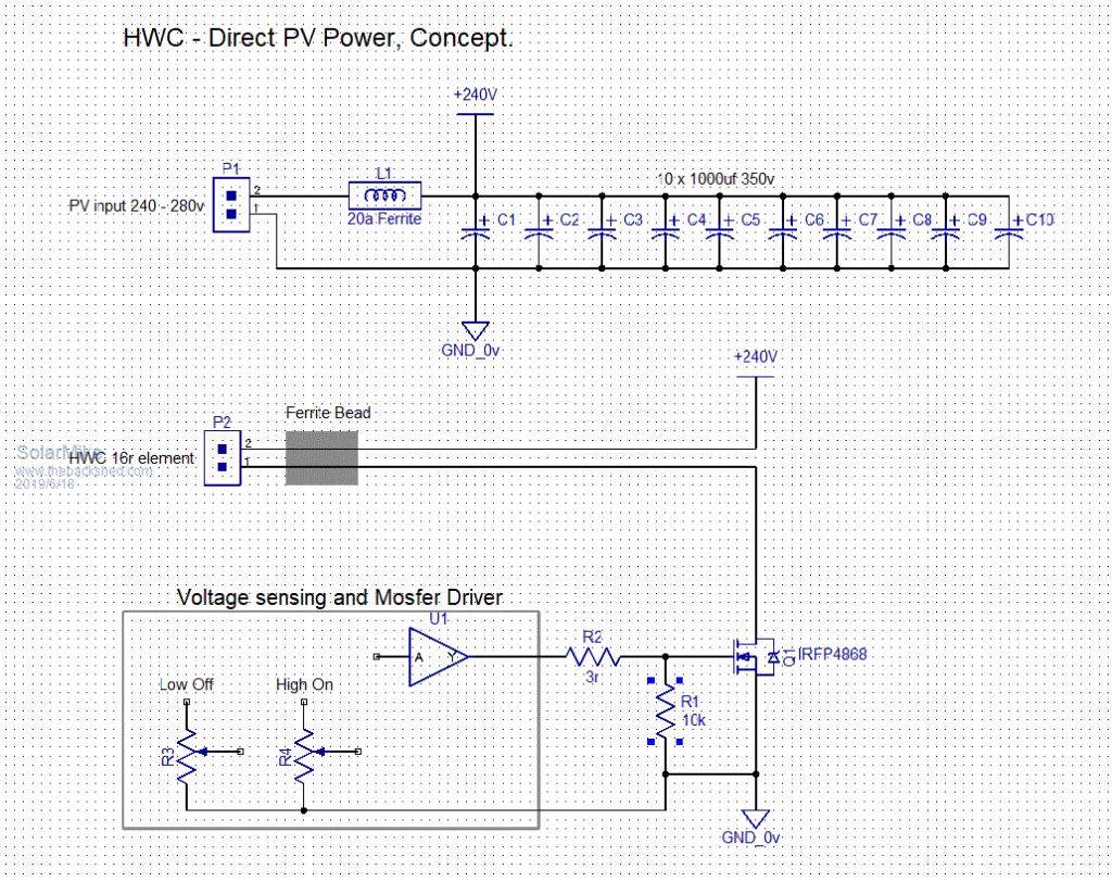 A mosfet will turn on, discharging the charged capacitor across the HWC element when its voltage reaches 240v and turn off when the cap voltage drops by approx 10%; whereon the panels charge it back to 240, if in full sun then at 8.3 amps, if less sun then will take longer.