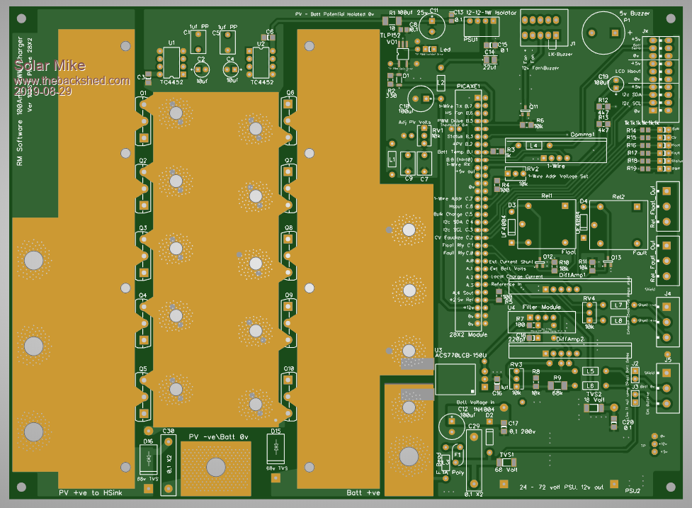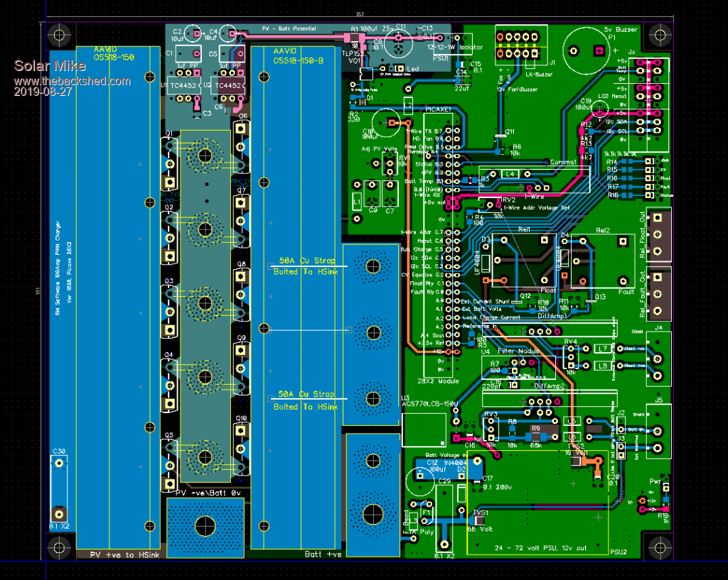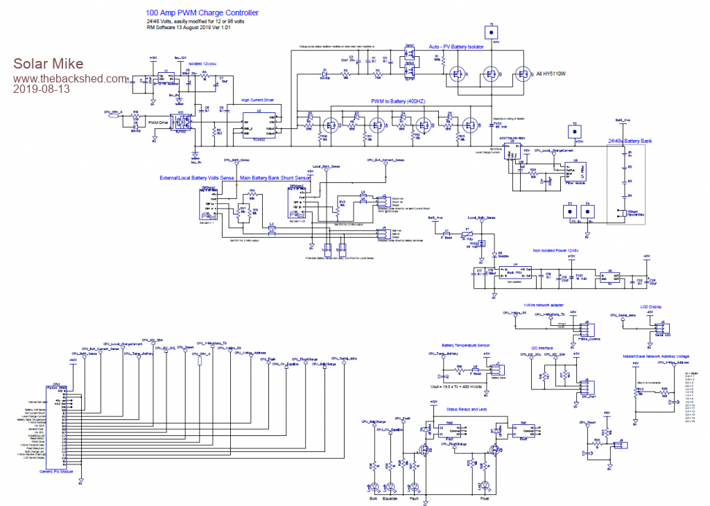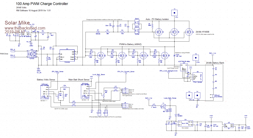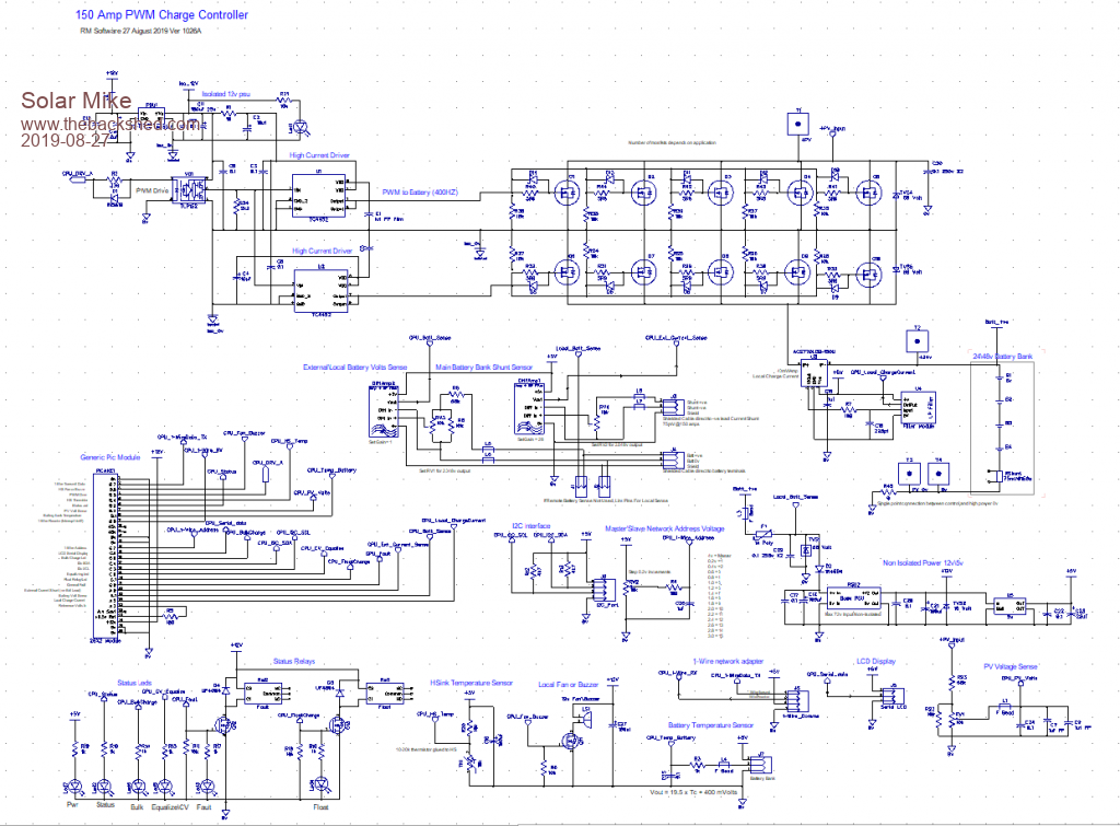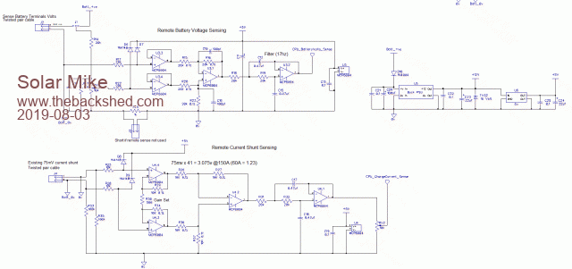 With many of my projects there is potentially lots of duplicated similar circuitry, items like Low Pass noise filters I now use a small plug in pcb module; similarly the above PWM charge controller requires a remote sense direct to the battery terminals and the remote current shunt. Most of the other controllers like the 3Kw MPPT also require remote sensing, passing high currents through even 50mm^2 charger cables cause incorrect voltage readings at the charger end.