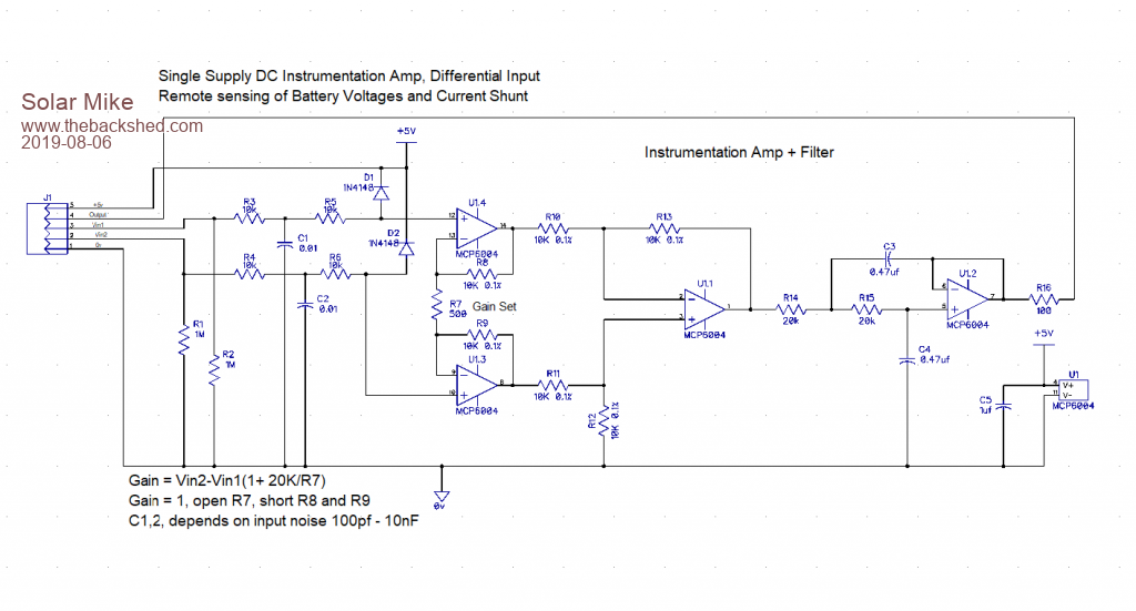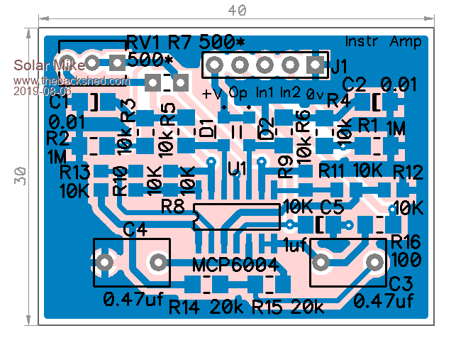 Here is the circuit for an instrumentation DC amp, runs off 5v, currently set for a gain of 41. This fits on to a 40x30mm pcb with a 5 pin rt angle pin connector.