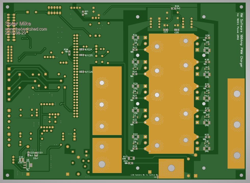 Final board size 222mm x 136mm, Mosfets bolt to alloy plate bottom panel, under the pcb. 10 x 2mm copper bars clamped and soldered to tinned areas.