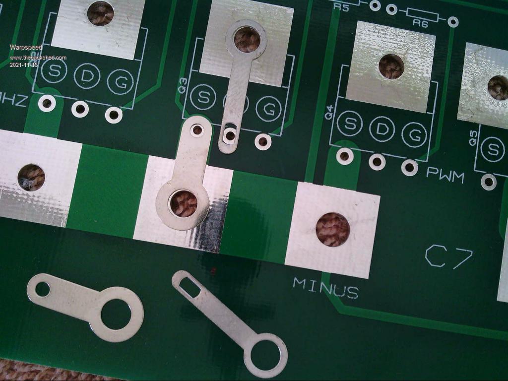 Have allowed more mosfets for higher currents if required, my current application only needs 2 x 3, leaving the other components off. The two heat sinks are used as current carrying bus bars with the mosfets bolted (no insulators), just have to sand the black anodizing off one surface first.